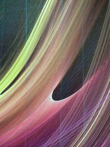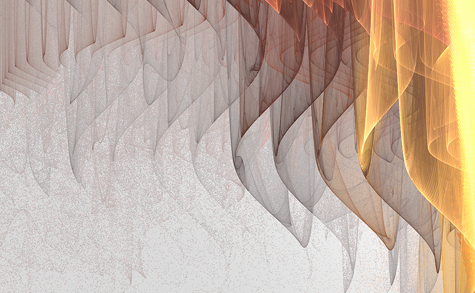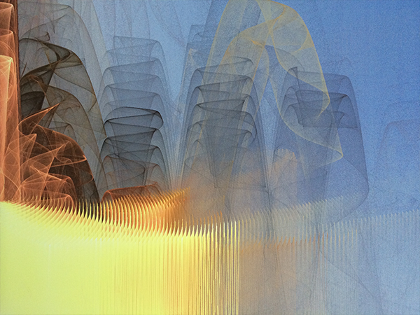 This stunning artwork is created with open-source ‘fractal flame’ software at very high resolutions. Post-rendering in Photoshop is also an integral part of the creative process. For example, the images are rendered with transparent backgrounds and then I create suitable backgrounds with Photoshop layers. Further enhancements are made with Photoshop graduations, levels and hue adjustments.